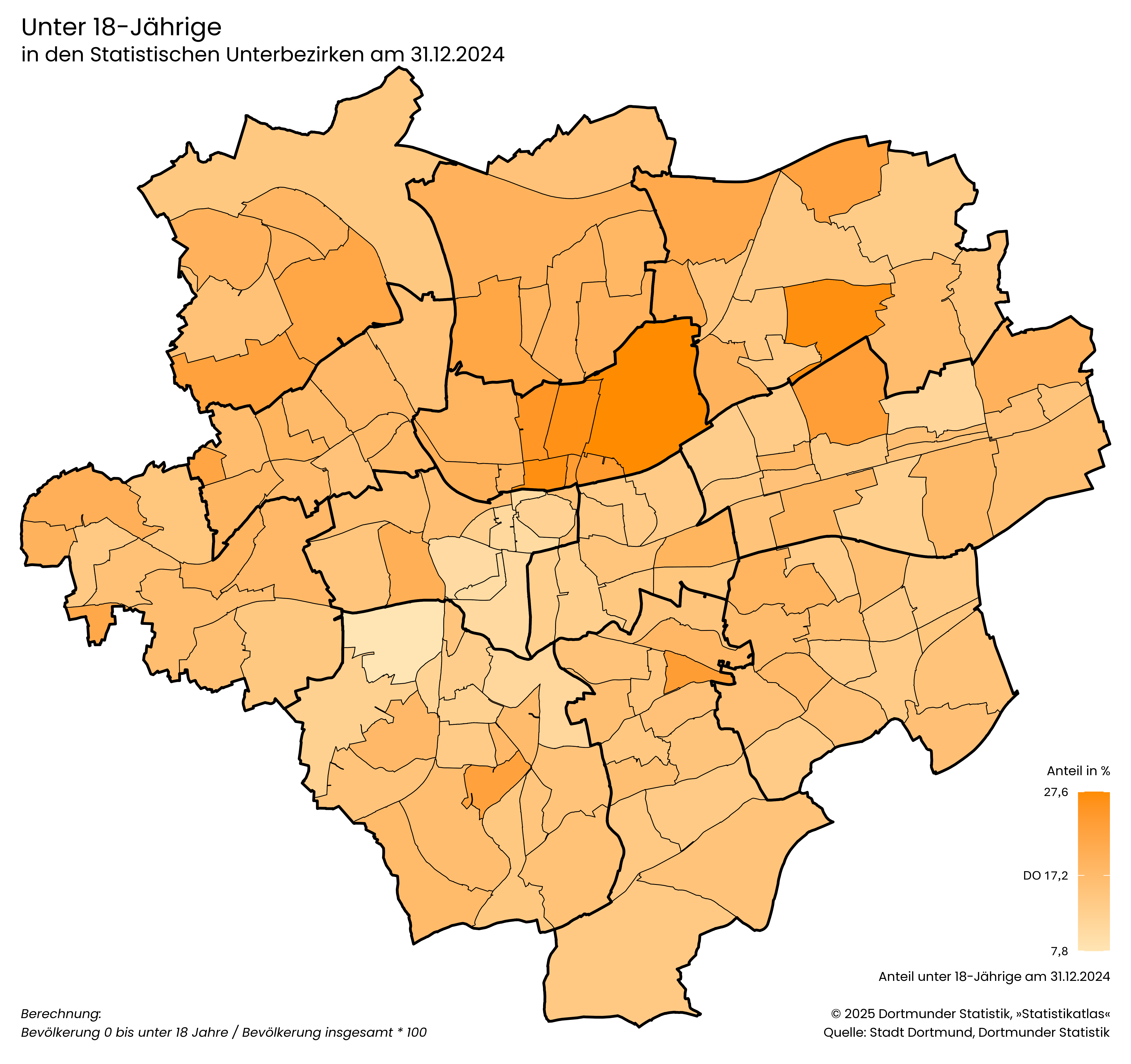 - Der Anteil der Minderjährigen in Dortmund liegt bei 17,2 %. Damit ist jede*r sechste Einwohner*in noch nicht volljährig.