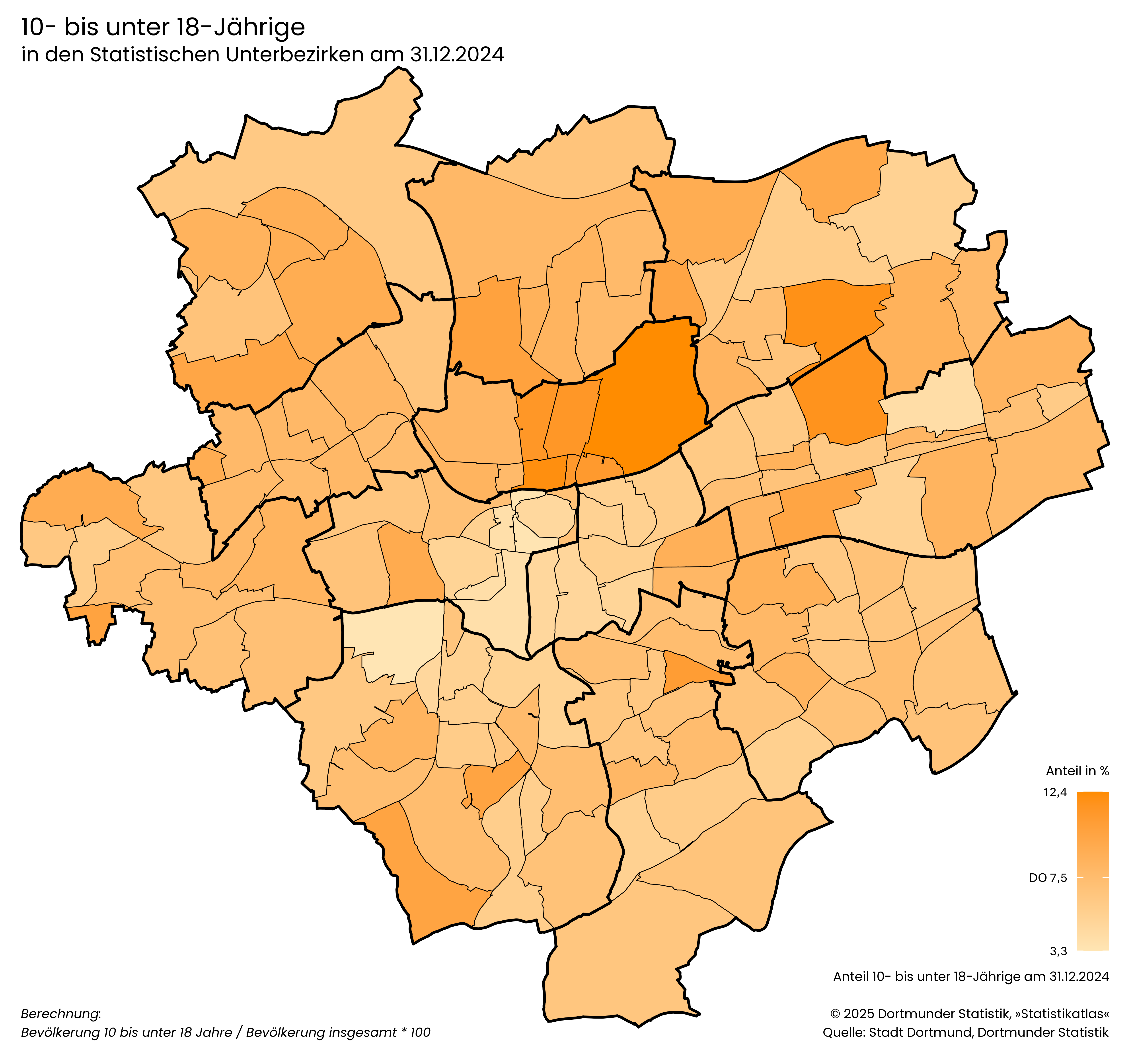 Bevölkerung 6 bis unter 10 Jahre / Bevölkerung insgesamt * 100- Der Anteil der 10- bis unter 18-Jährigen liegt in Dortmund bei 7,5 %.