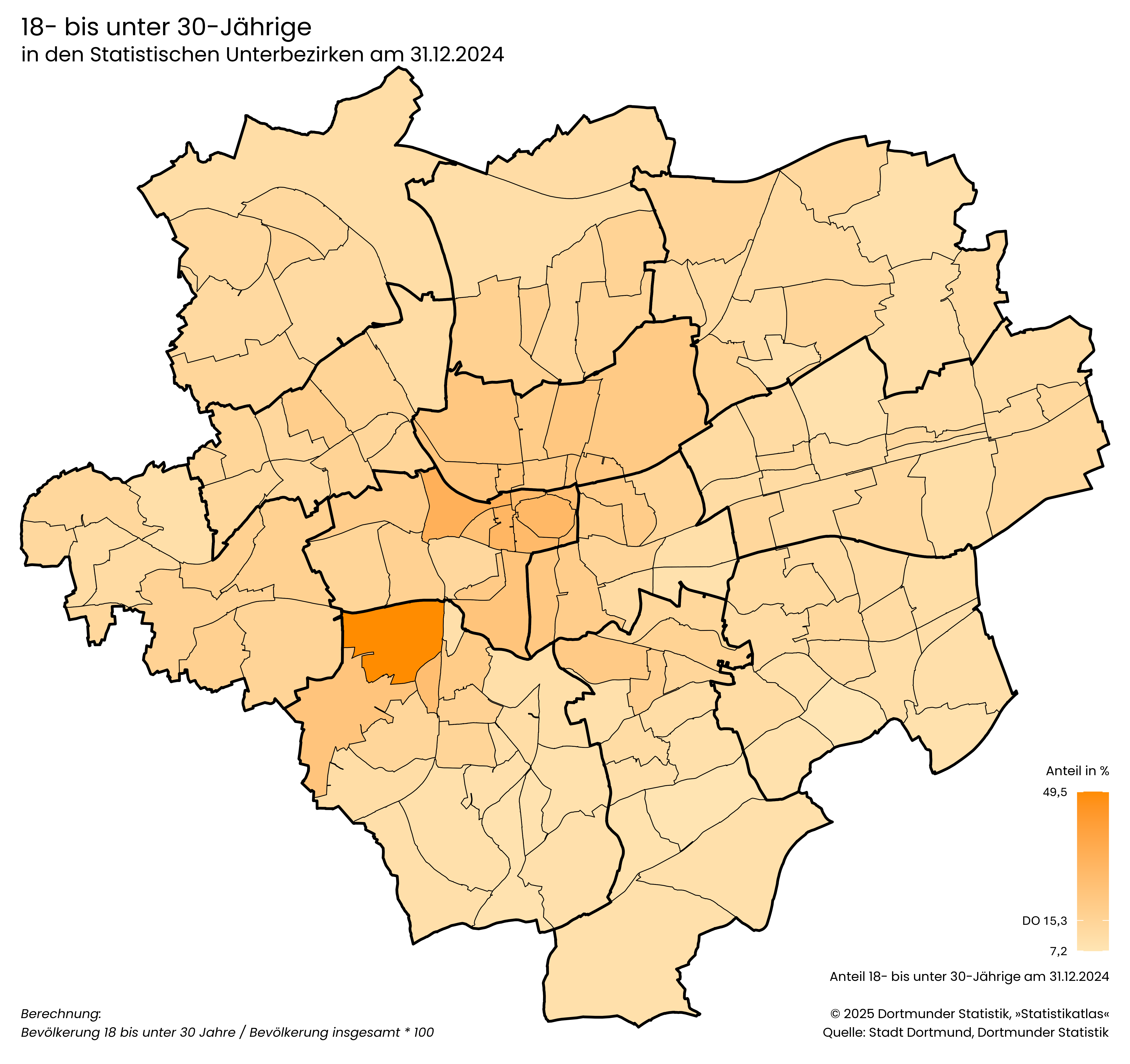 Bevölkerung 10 bis unter 18 Jahre / Bevölkerung insgesamt * 100- Der Anteil der jungen Erwachsenen von 18 bis unter 30 Jahren liegt in Dortmund bei 15,3 %.