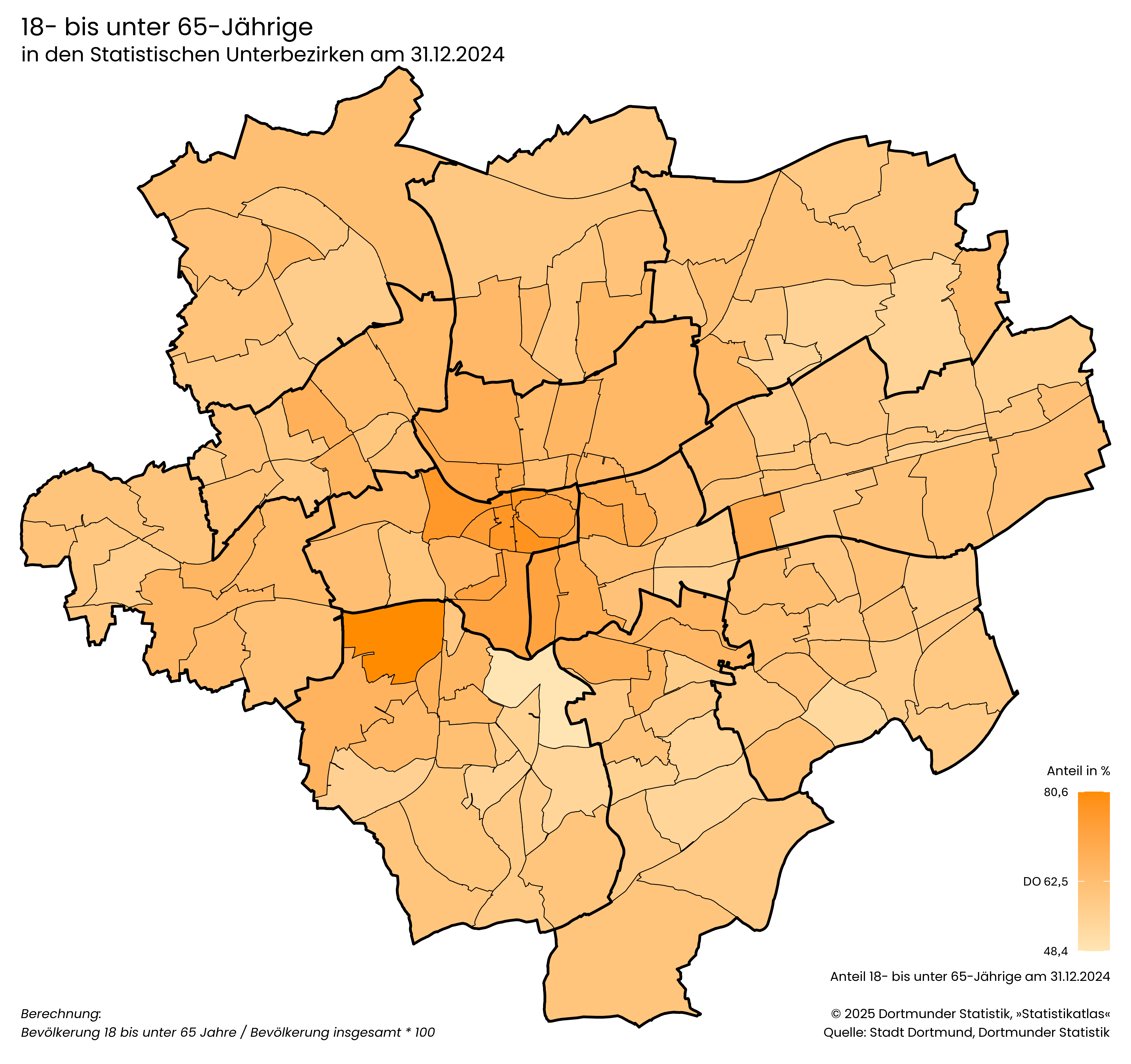 Bevölkerung 18 bis unter 65 Jahre / Bevölkerung insgesamt * 100- Ein Fünftel der Dortmunder Bevölkerung gehört zu den Senior*innen, ist also 65 Jahre und älter.
