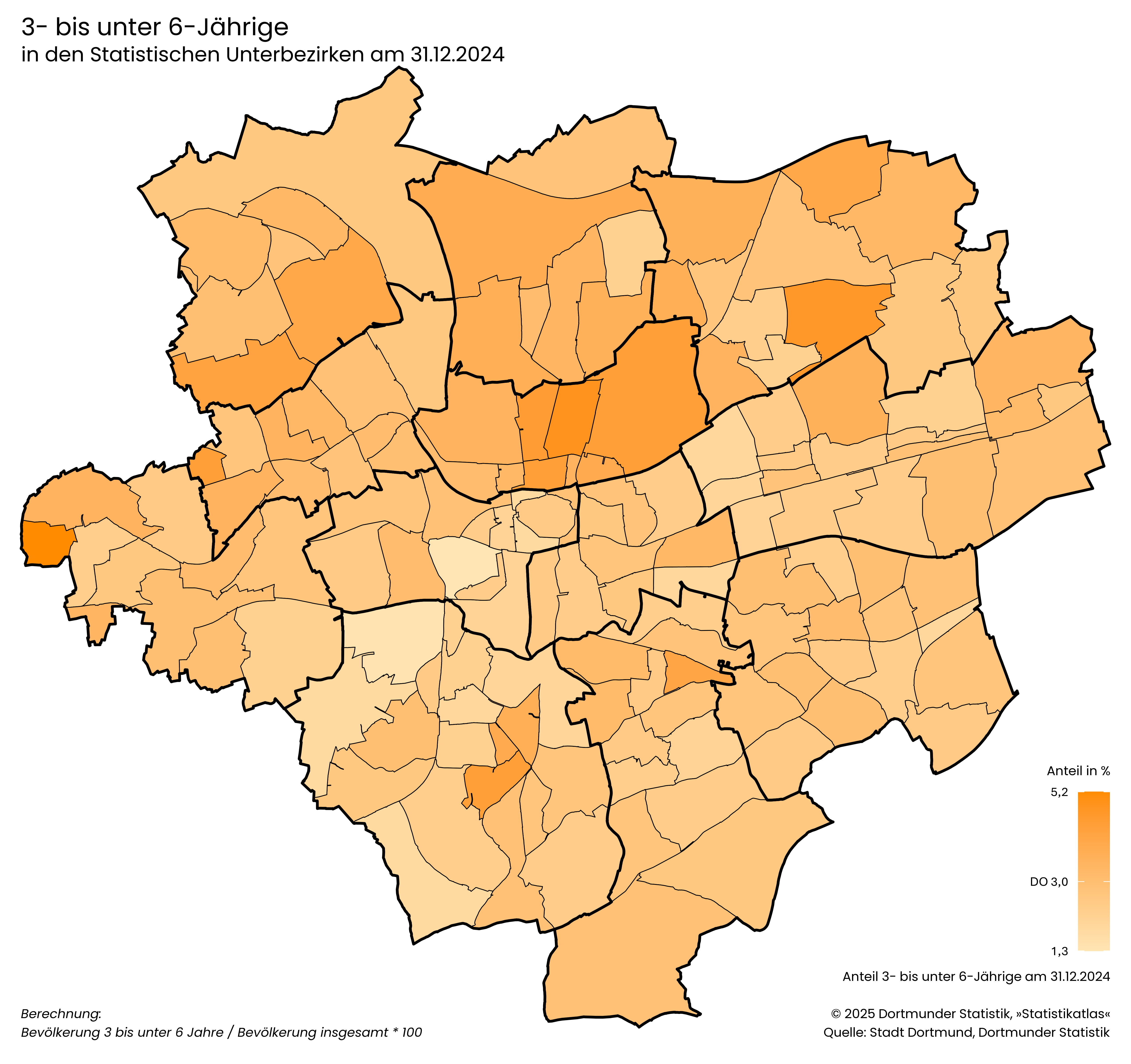 Bevölkerung 0 bis unter 3 Jahre / Bevölkerung insgesamt * 100- Der Anteil der 3- bis unter 6-Jährigen liegt in Dortmund bei 3,0 %.