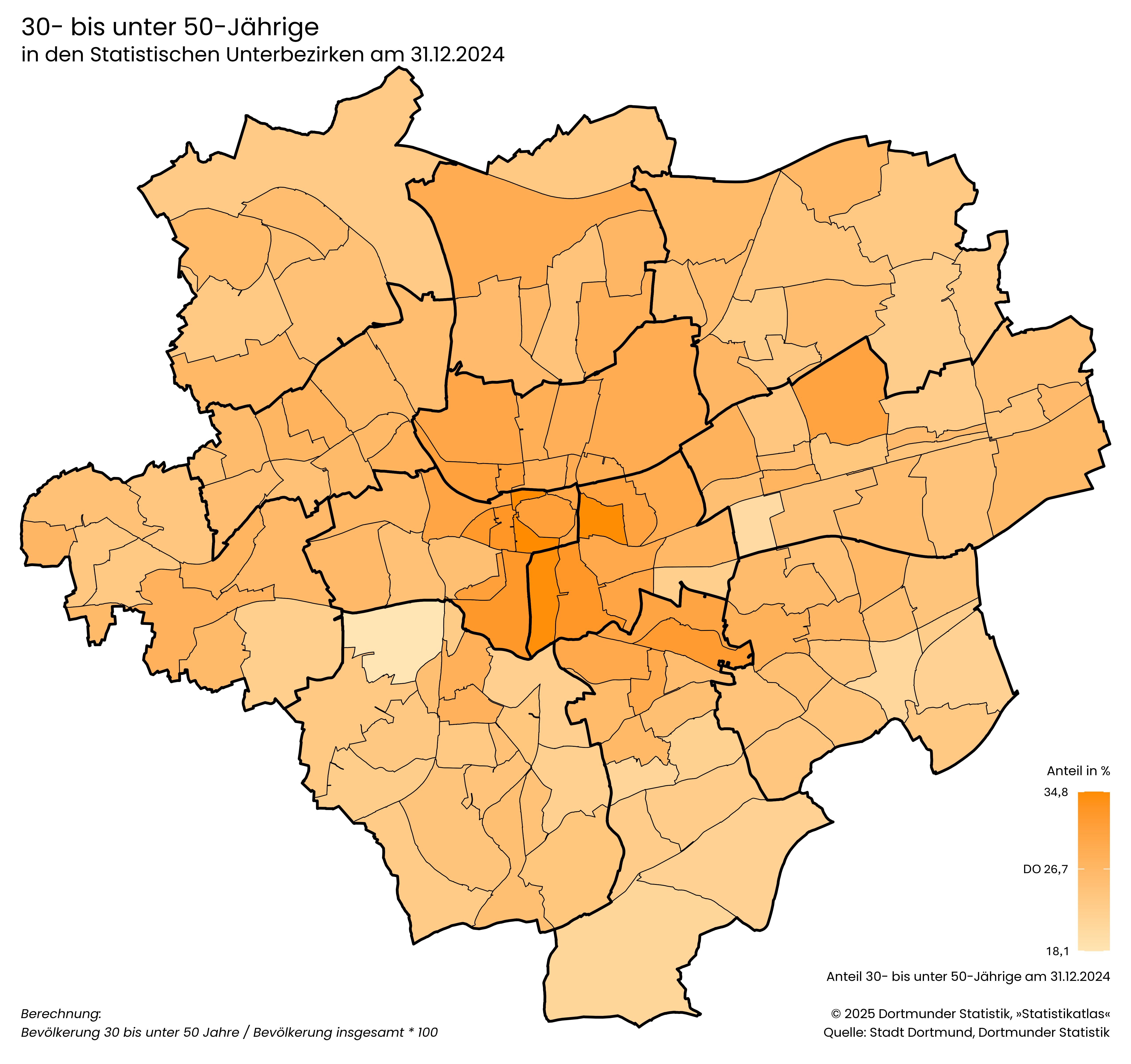 Bevölkerung 18 bis unter 30 Jahre / Bevölkerung insgesamt * 100- Der Anteil der Bevölkerung im Alter von 30 bis unter 50 Jahren liegt in Dortmund bei 26,7 %.