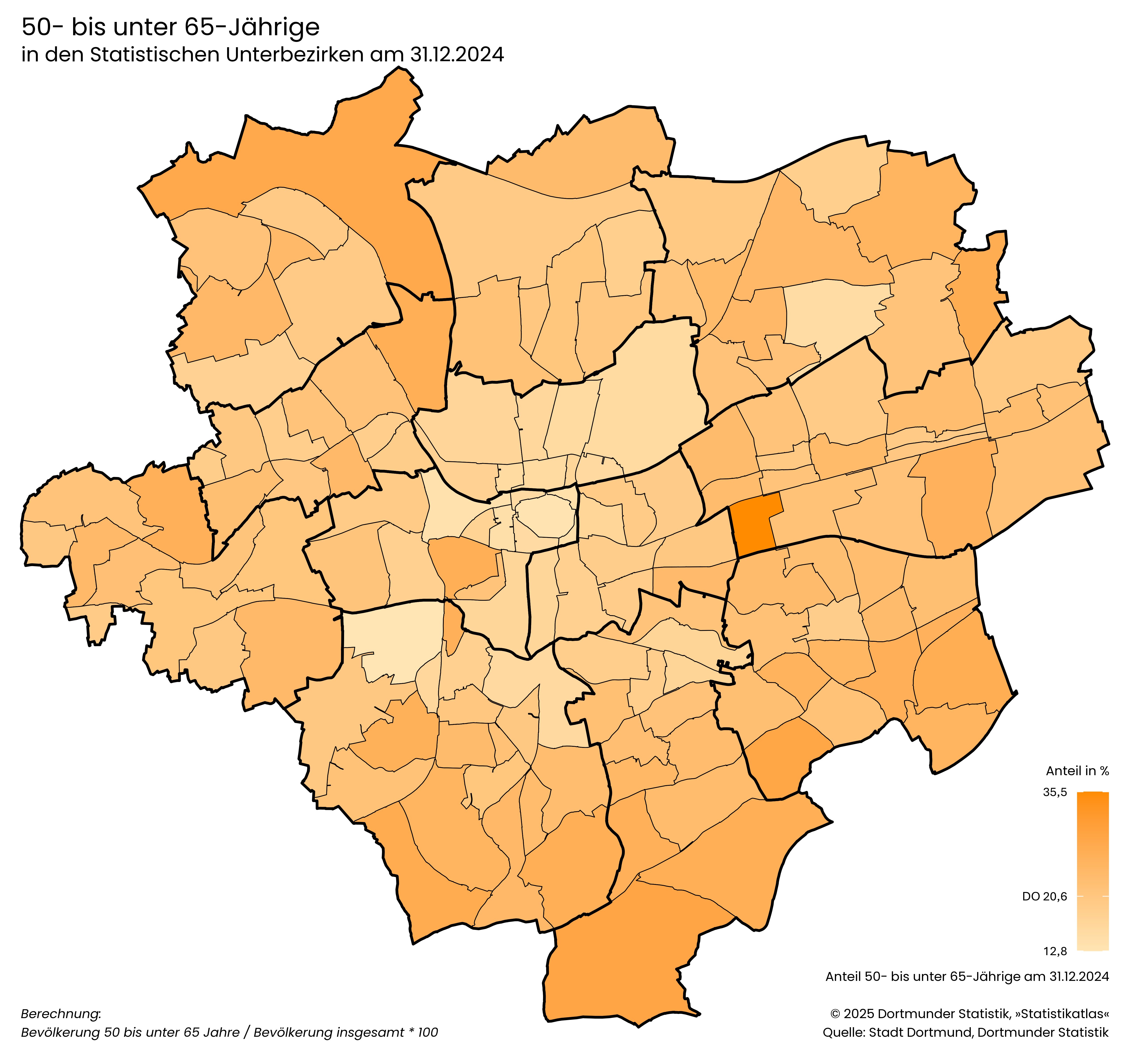 Bevölkerung 30 bis unter 50 Jahre / Bevölkerung insgesamt * 100- Der Anteil der 50- bis unter 65-Jährigen liegt in Dortmund bei 20,6 %.