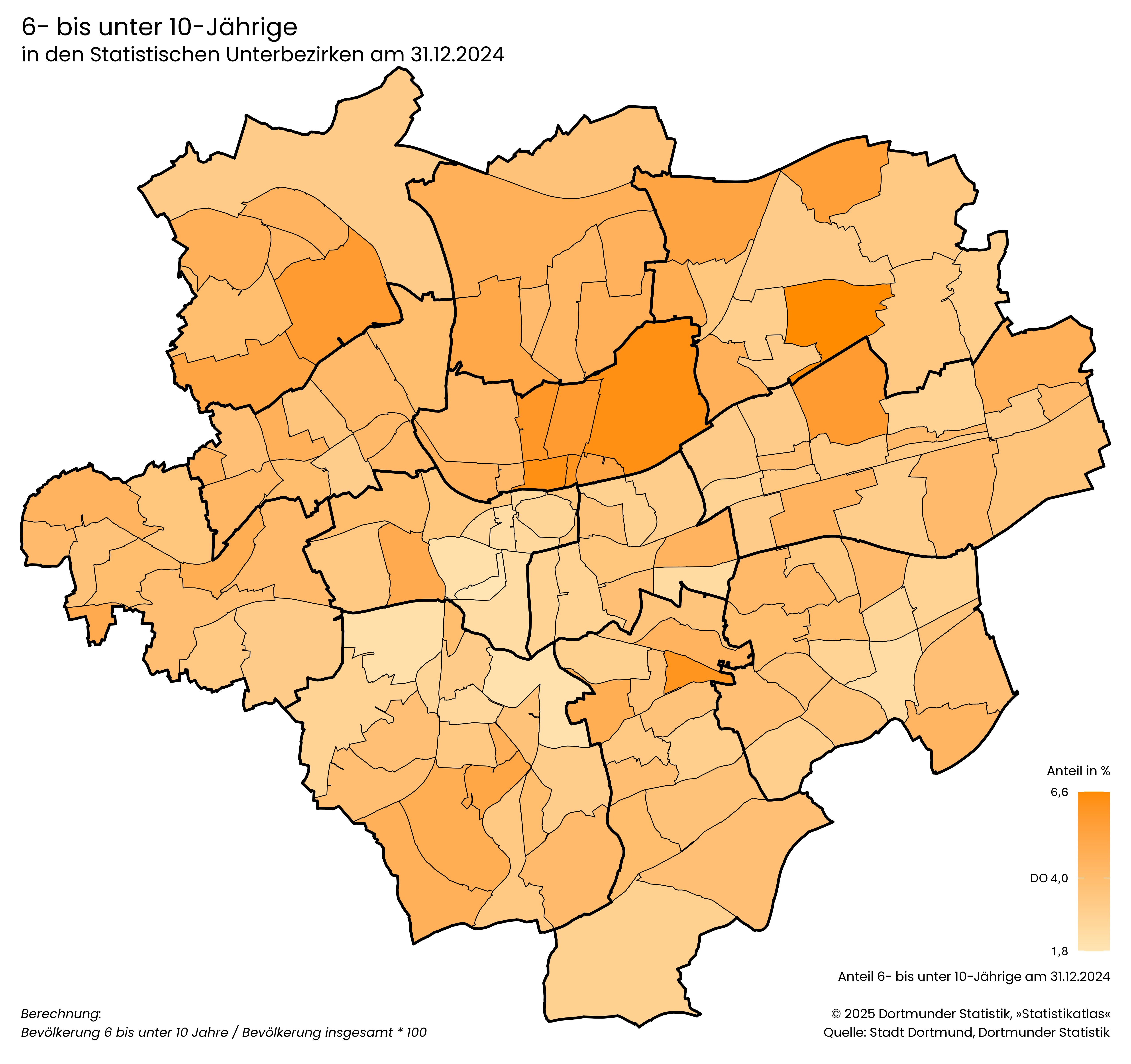 Bevölkerung 3 bis unter 6 Jahre / Bevölkerung insgesamt * 100- Der Anteil der 6- bis unter 10-Jährigen liegt in Dortmund bei 4,0 %.