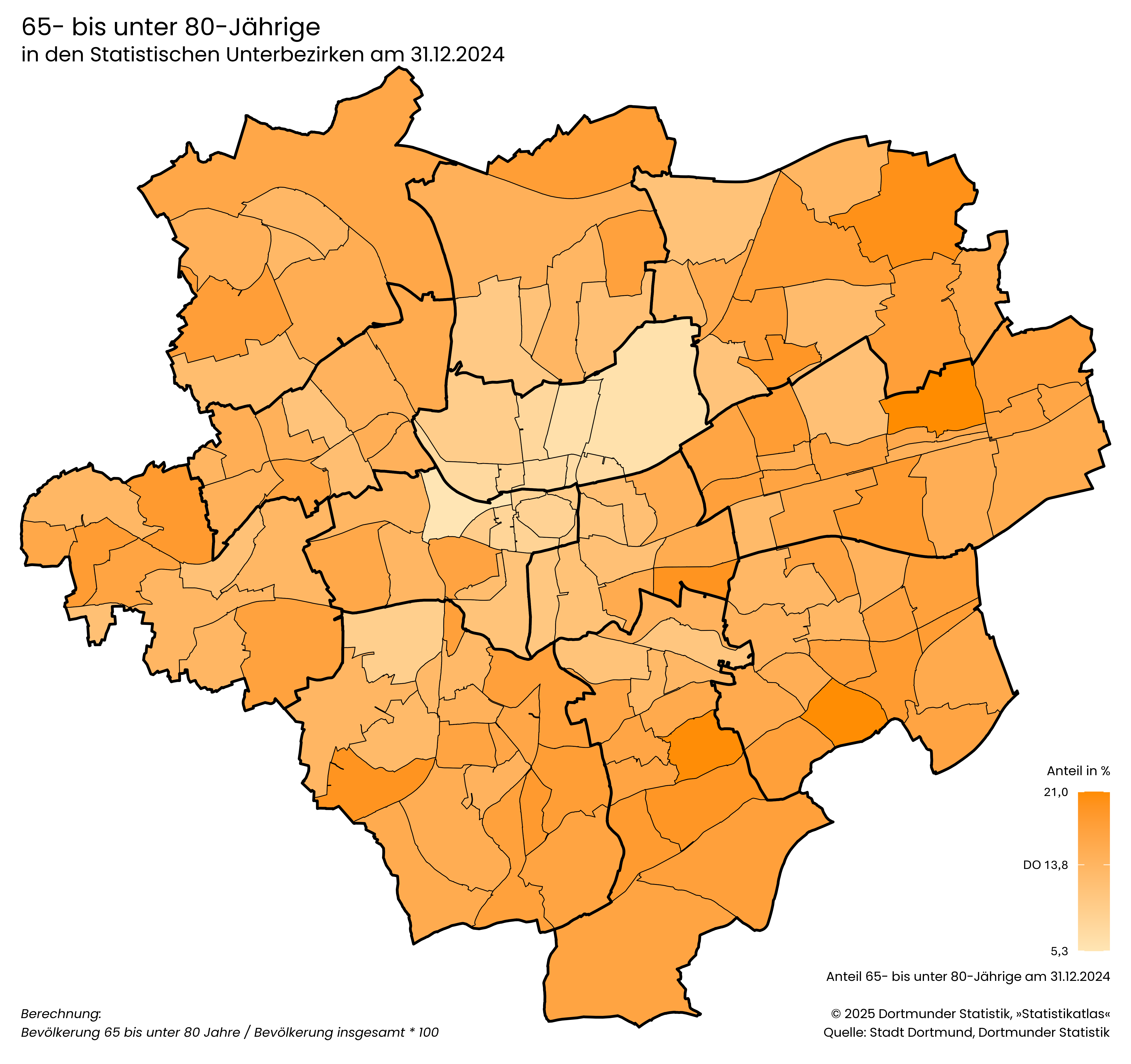 Bevölkerung 50 bis unter 65 Jahre / Bevölkerung insgesamt * 100- Der Anteil der jungen Senior*innen von 65 bis unter 80 Jahren liegt in Dortmund bei 13,8 %.