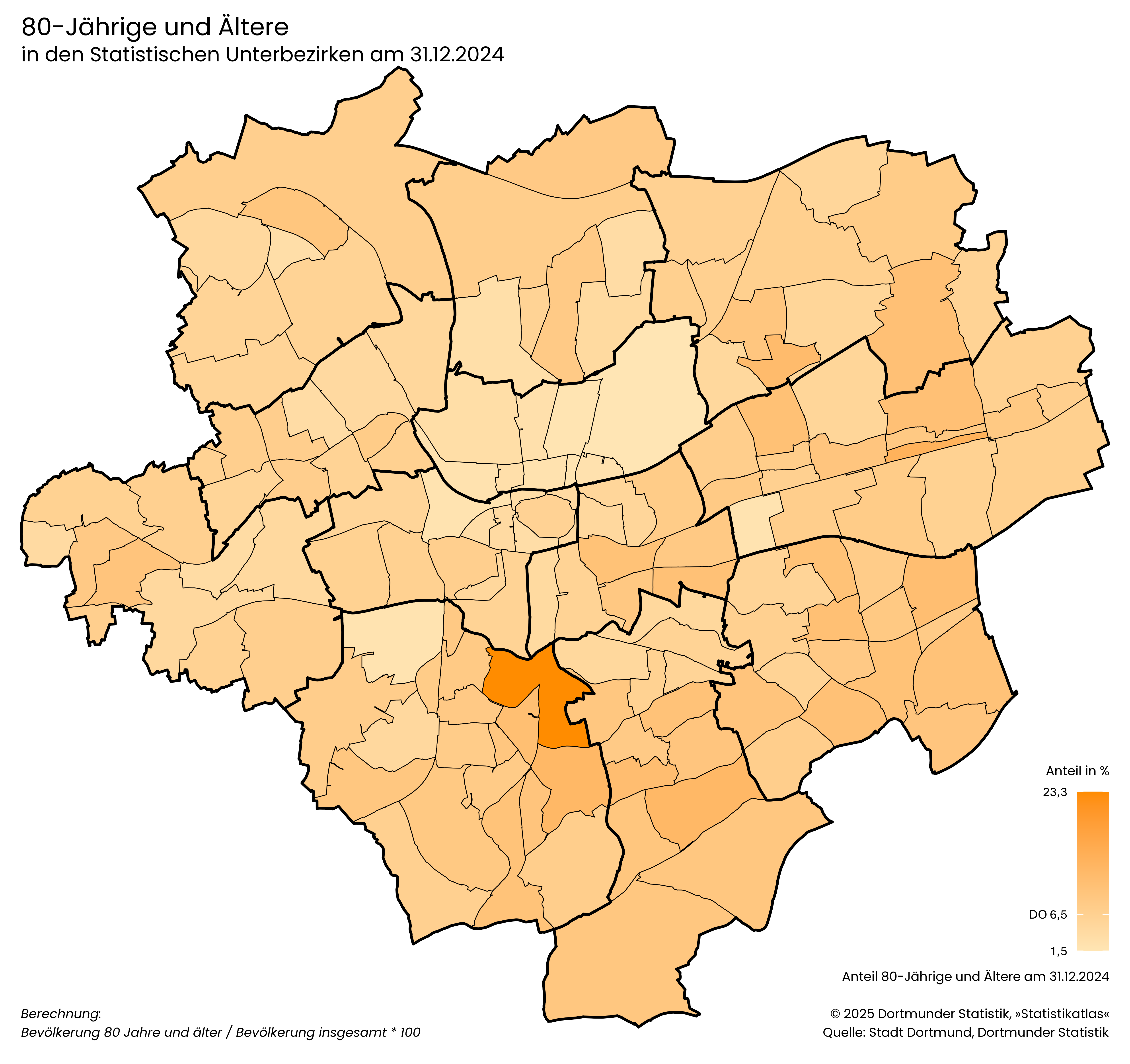 Bevölkerung 65 bis unter 80 Jahre / Bevölkerung insgesamt * 100- Der Anteil der älteren Senior*innen ab 80 Jahren liegt in Dortmund bei 6,5 %.