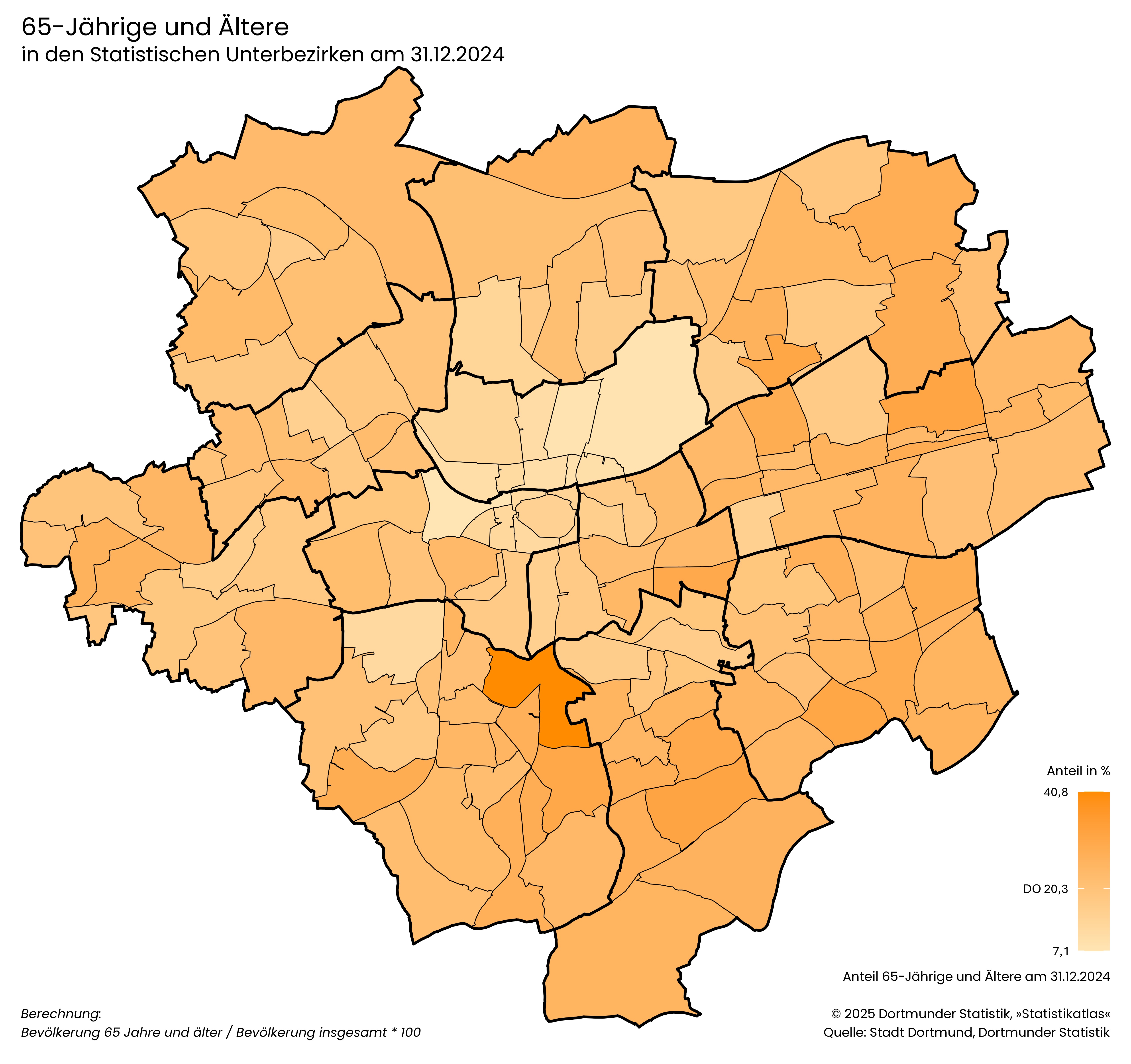 - Die Anteile reichen im Stadtgebiet von 7,1 % im Unterbezirk "Union" bis zu 40,8 % in "Brünninghausen/Rombergpark" mit vielen Senioreneinrichtungen. Der zweithöchste Wert liegt in "Höchsten" mit 31,9 %, das heißt fast jede*r Dritte ist dort bereits im Seniorenalter.